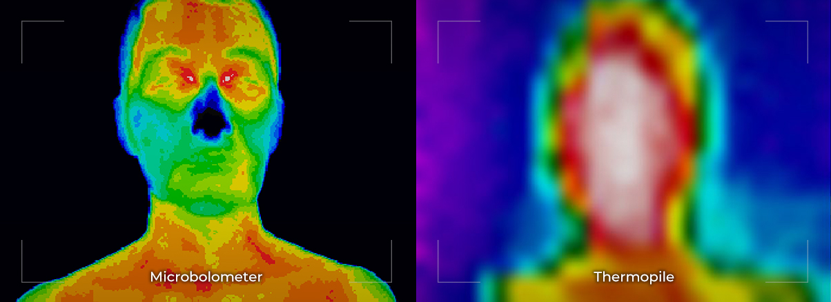 In contrast, a thermal camera with microbolometer sensors produces high resolution images with more than 10,000 pixels. This enables microbolometer-type cameras to measure temperature more precisely than their thermopile counterparts. Microbolometer sensors also capture information much more quickly and accurately from a range of positions, so subjects do not need to stand still to be measured. This enables swift measurement of people as they walk past the camera.