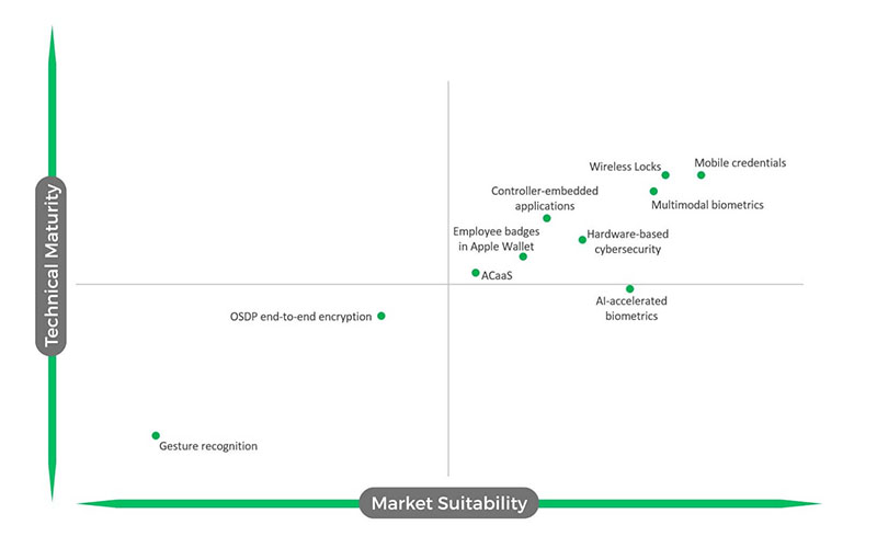 Mobile credentialsMobile credentials have gained strong market acceptance in security over the past years. This is confirmed by our tech survey in which mobile credentials garnered suitability and technical maturity scores of 4.24 and 3.92, respectively. Indeed, the benefits of mobile credentials are quite clear. Conventional solutions such as keycards and keyfobs can be easily forgotten by users, but they almost always bring their smart devices. Making keycards and keyfobs also carries a cost, whereas mobile credentials can just be uploaded to the user’s device. At the same time, mobile credentials have also become more technically mature. The technology leverages Bluetooth Low Energy (BLE), NFC, and increasingly, Ultra-Wideband (UWB) – all of which are now supported across major mobile operating systems. Integration with digital wallets such as Apple Wallet and Google Wallet has become standardized for secure credential storage. These factors have contributed to mobile credentials’ strong growth, which is unlikely to stop anytime soon. |